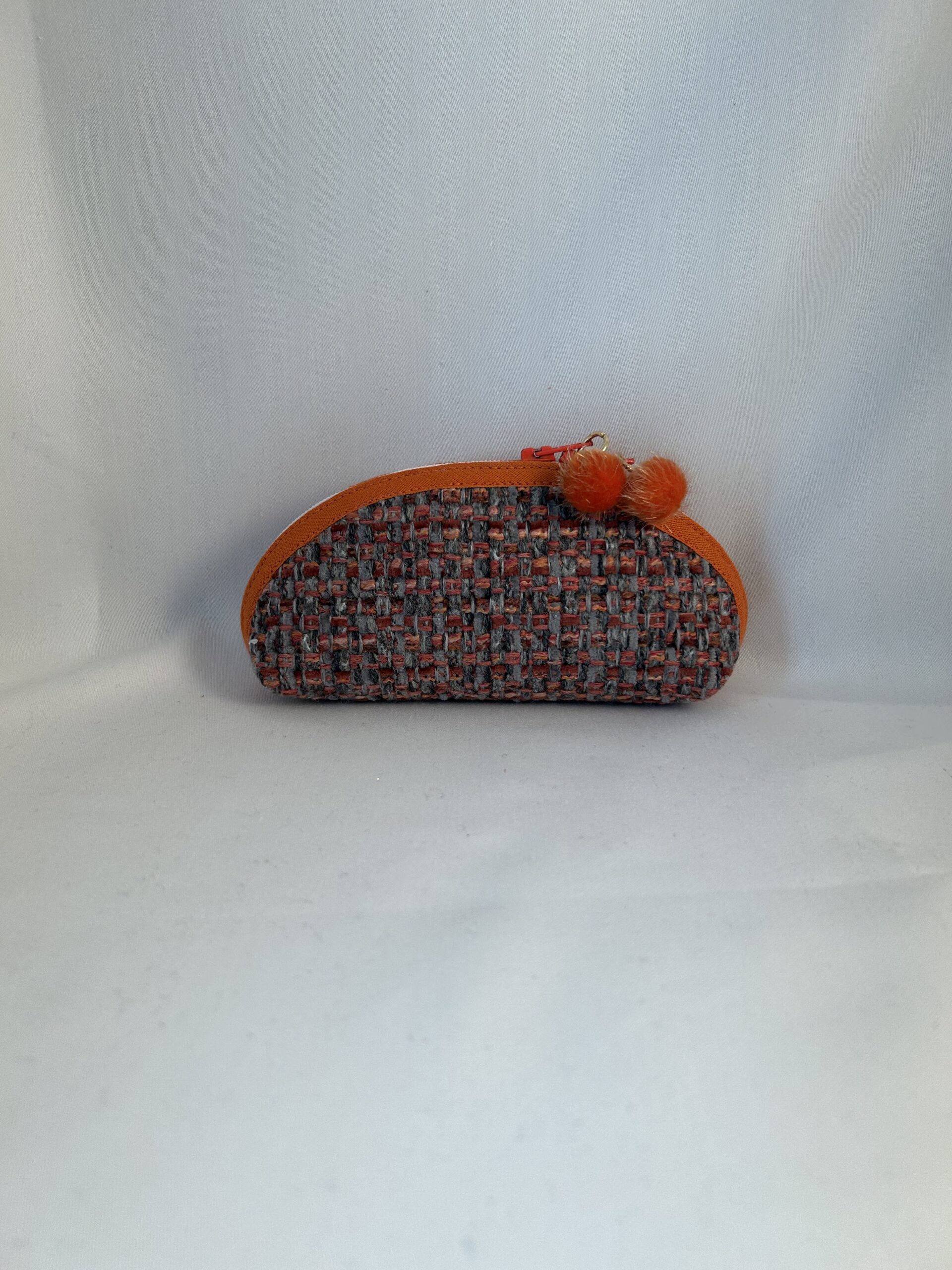 Dit unieke rond etui is met zorg gemaakt van leer en meubelstof . elk exemplaar is daardoor nét even anders en heeft zijn eigen karakter. Duurzaam, stijlvol en praktisch in gebruik.