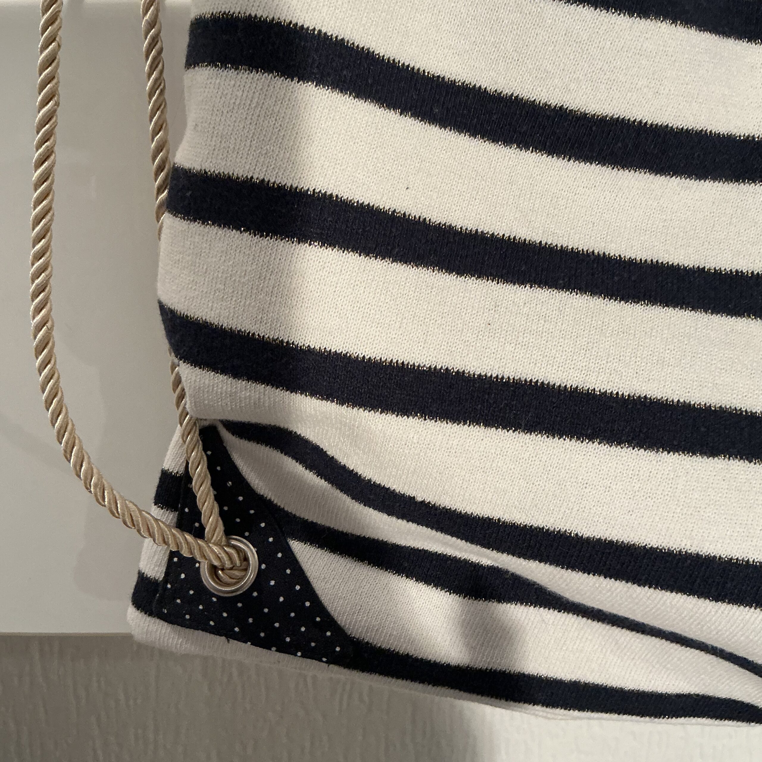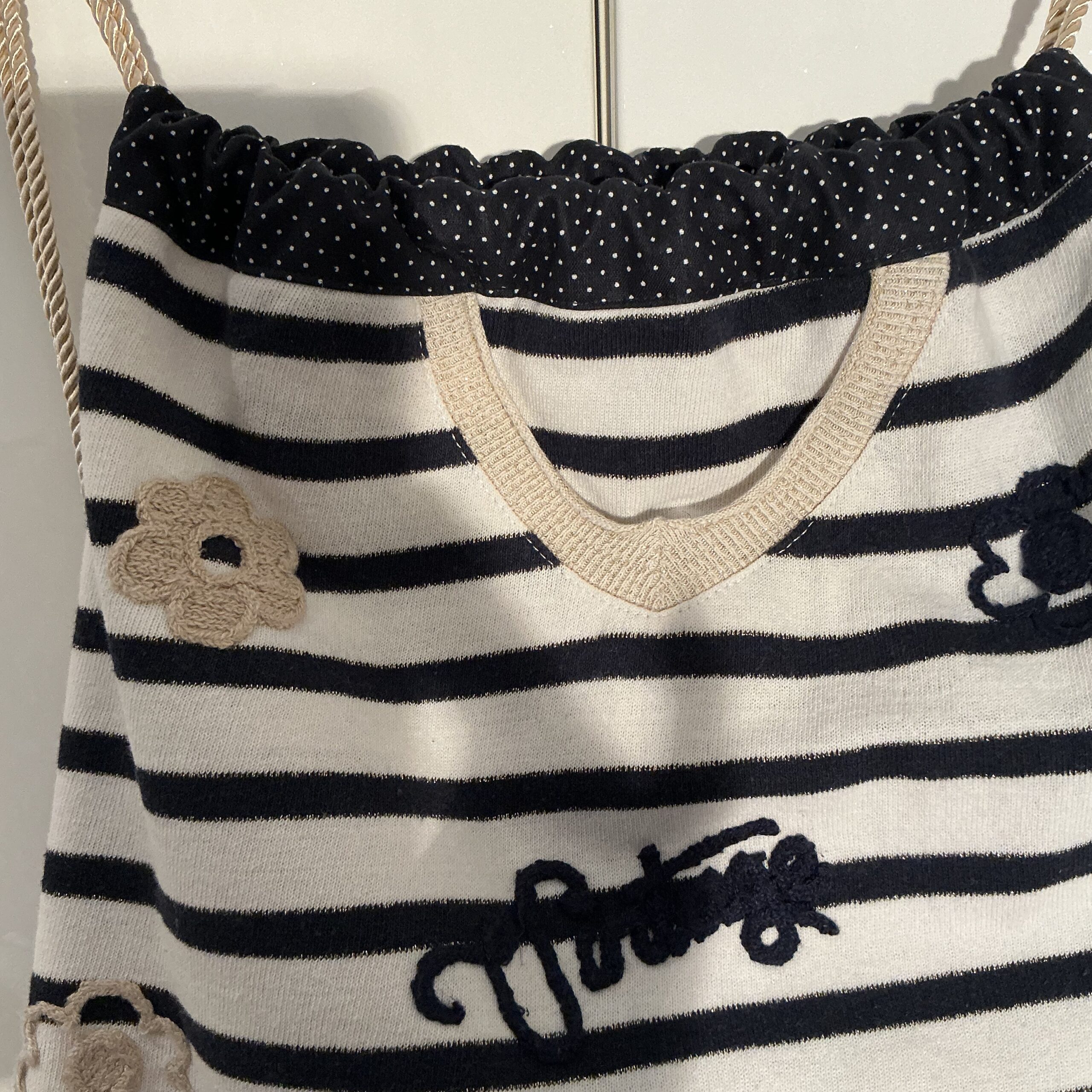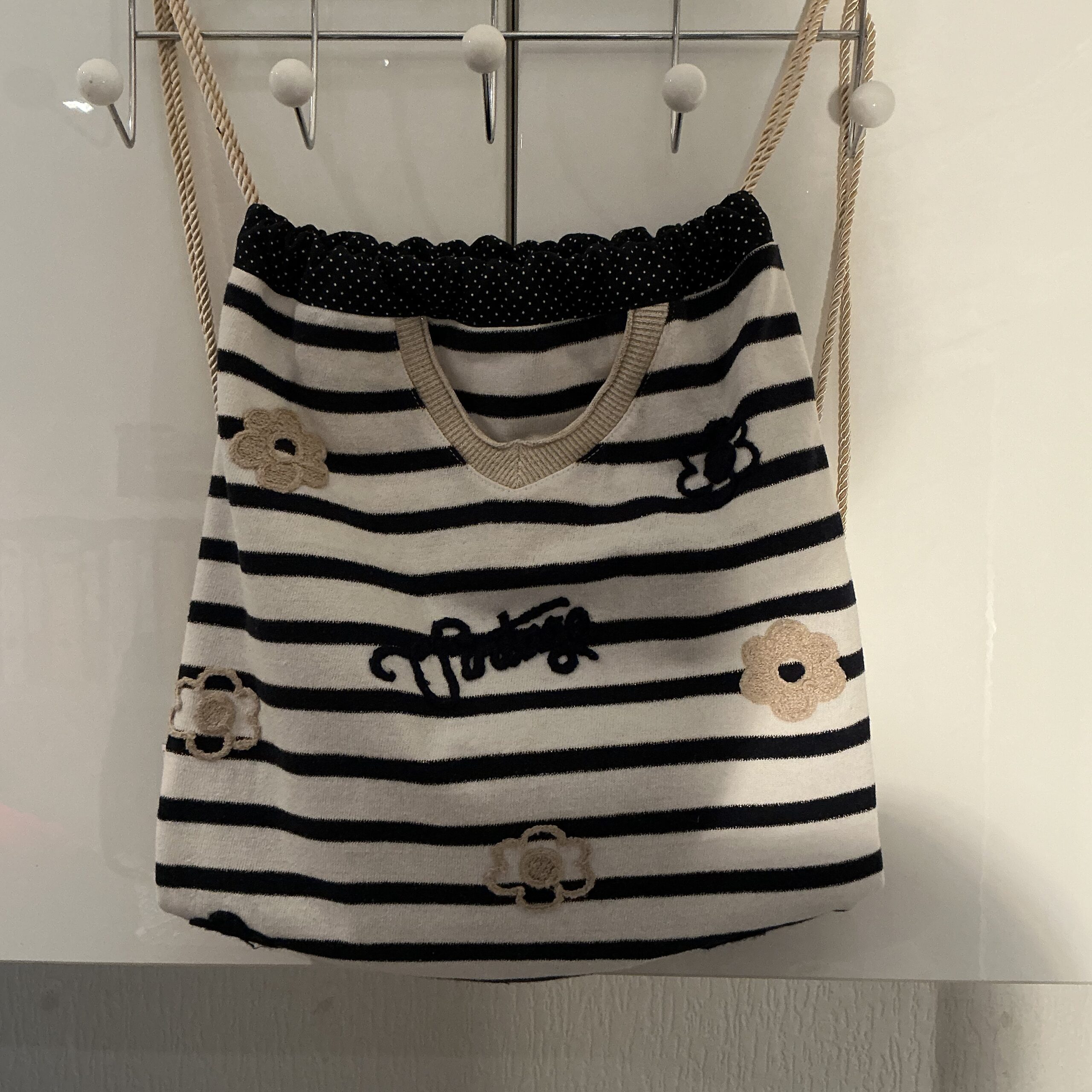 De gouden koord hengsels geven de tas een elegante en speelse uitstraling. Zowel aan de binnen- als buitenkant zijn mooie details van de oorspronkelijke trui verwerkt, waardoor elk exemplaar uniek is.