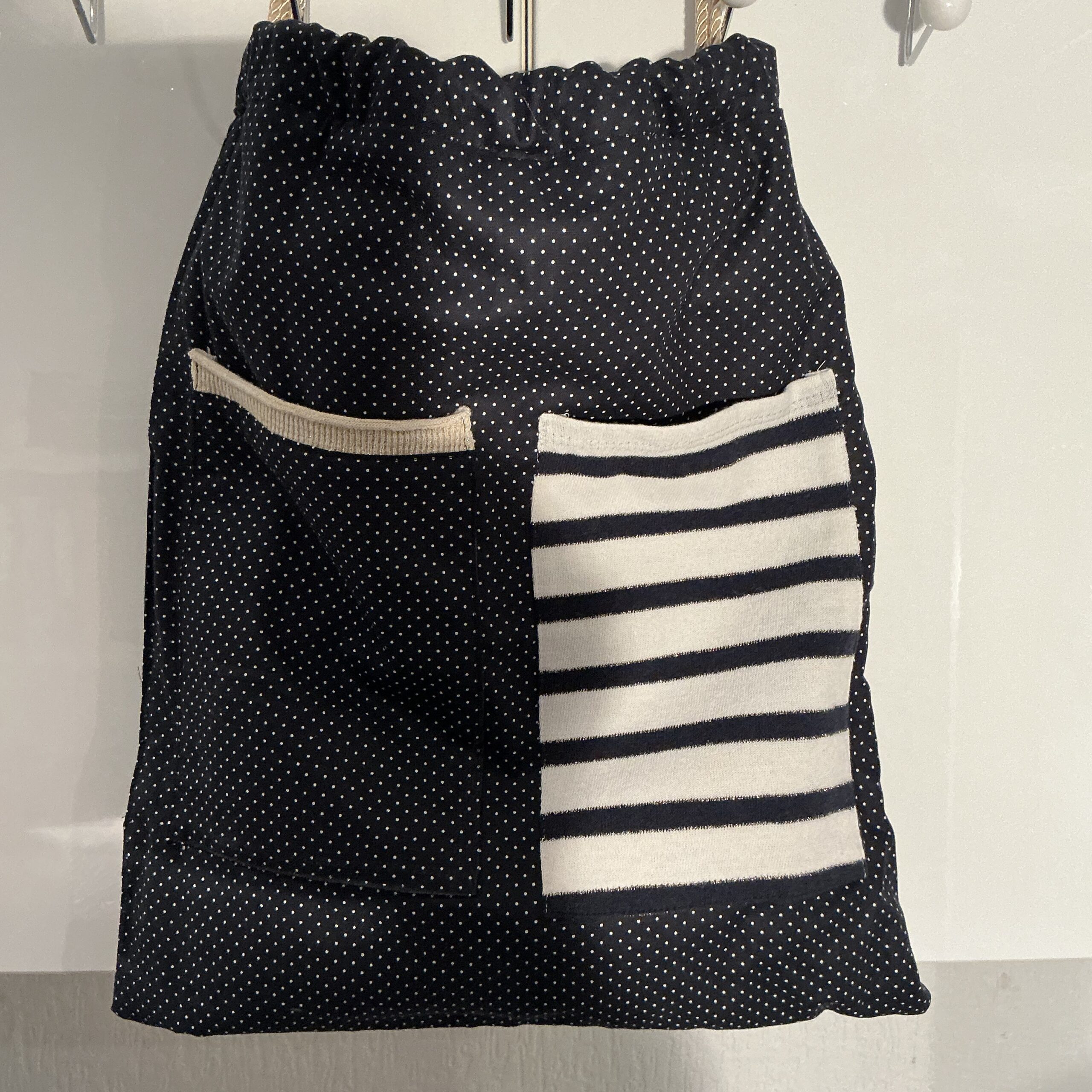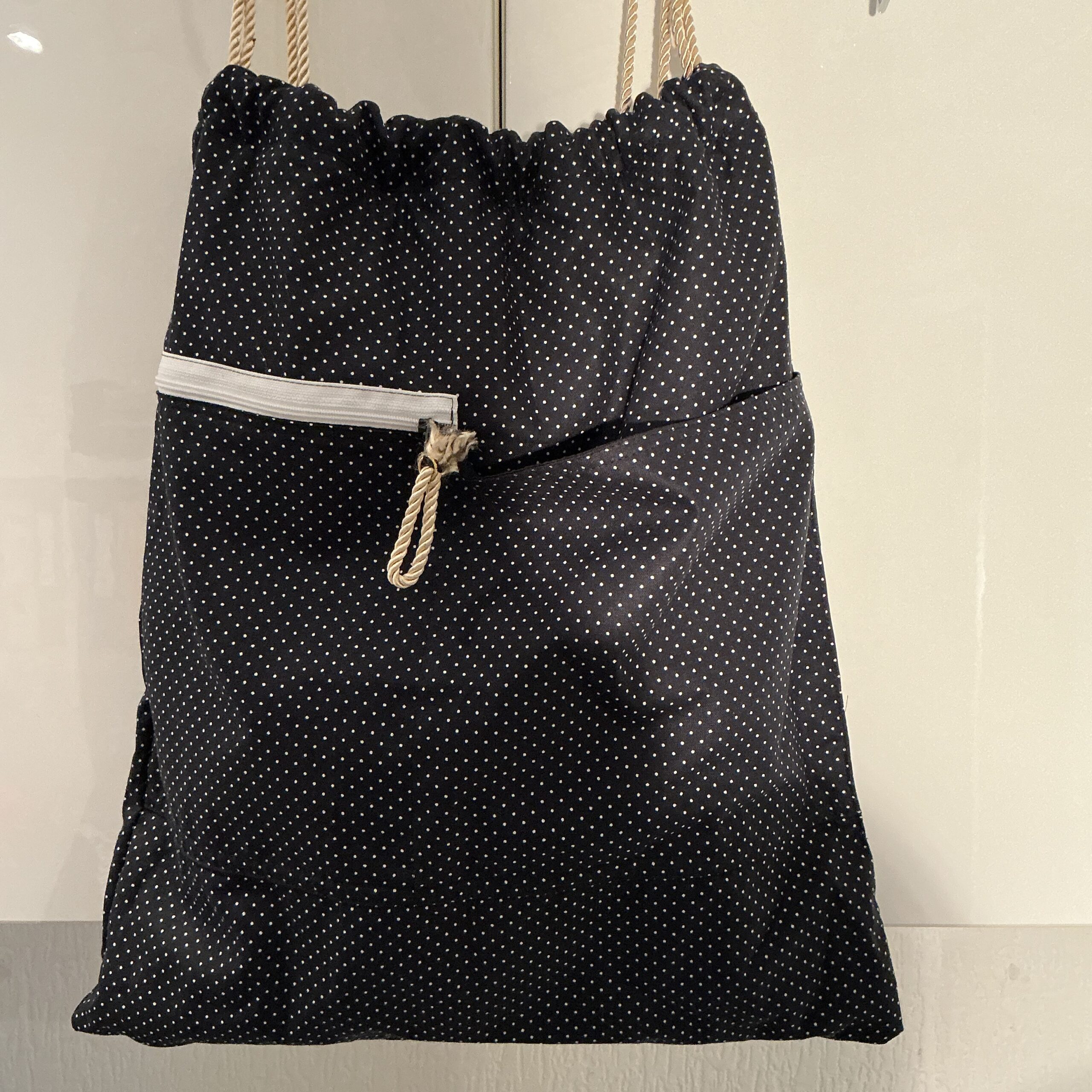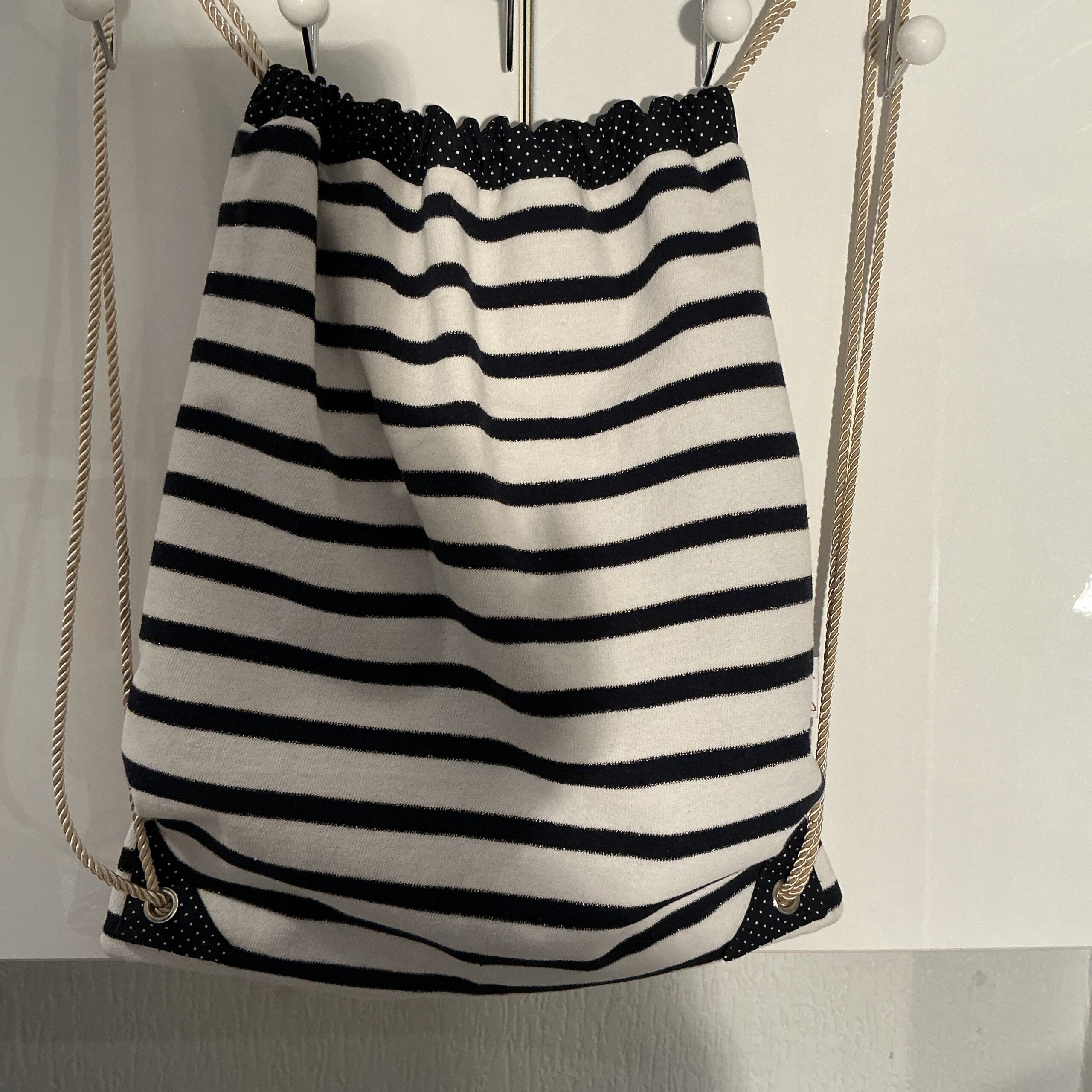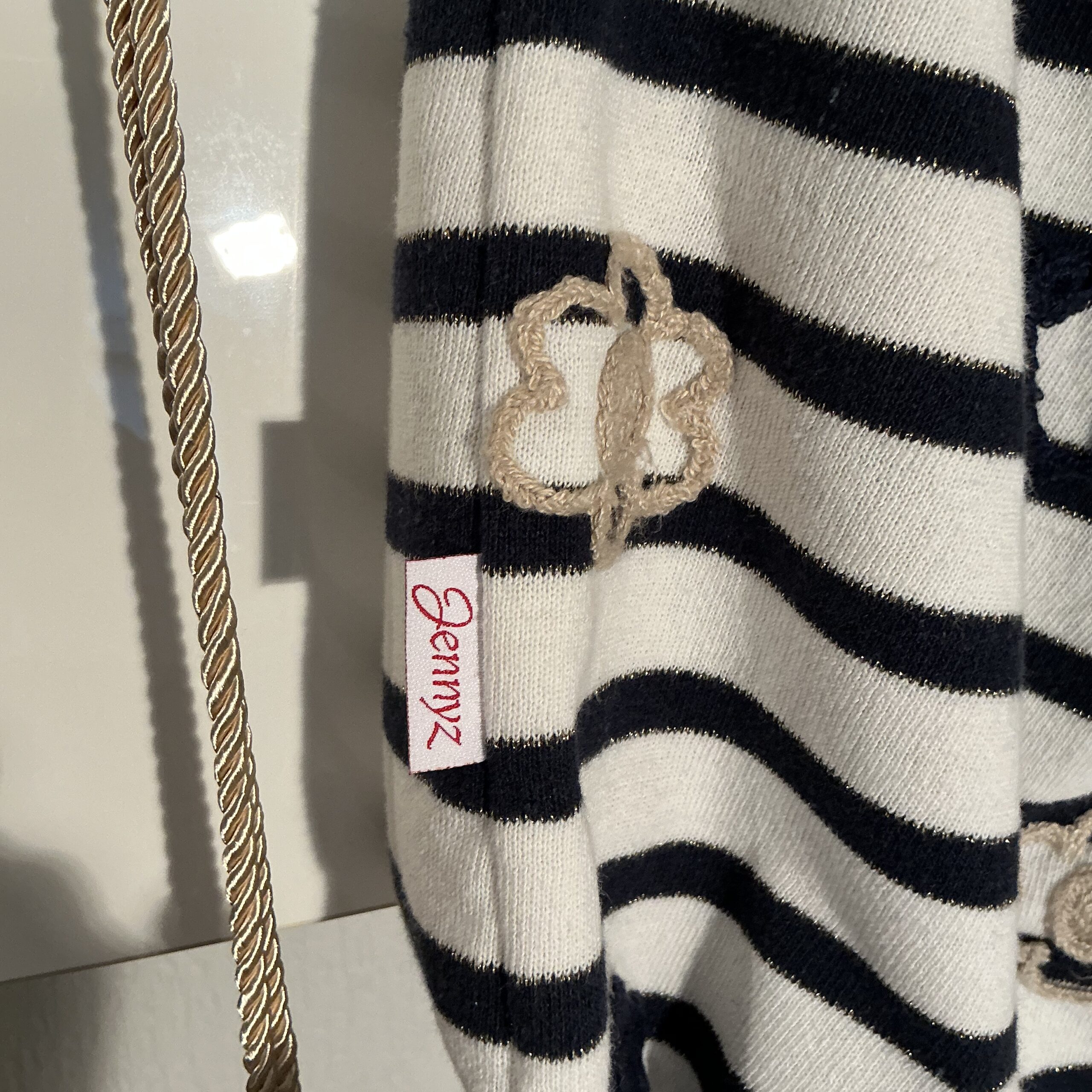 De gouden koord hengsels geven de tas een elegante en speelse uitstraling. Zowel aan de binnen- als buitenkant zijn mooie details van de oorspronkelijke trui verwerkt, waardoor elk exemplaar uniek is.