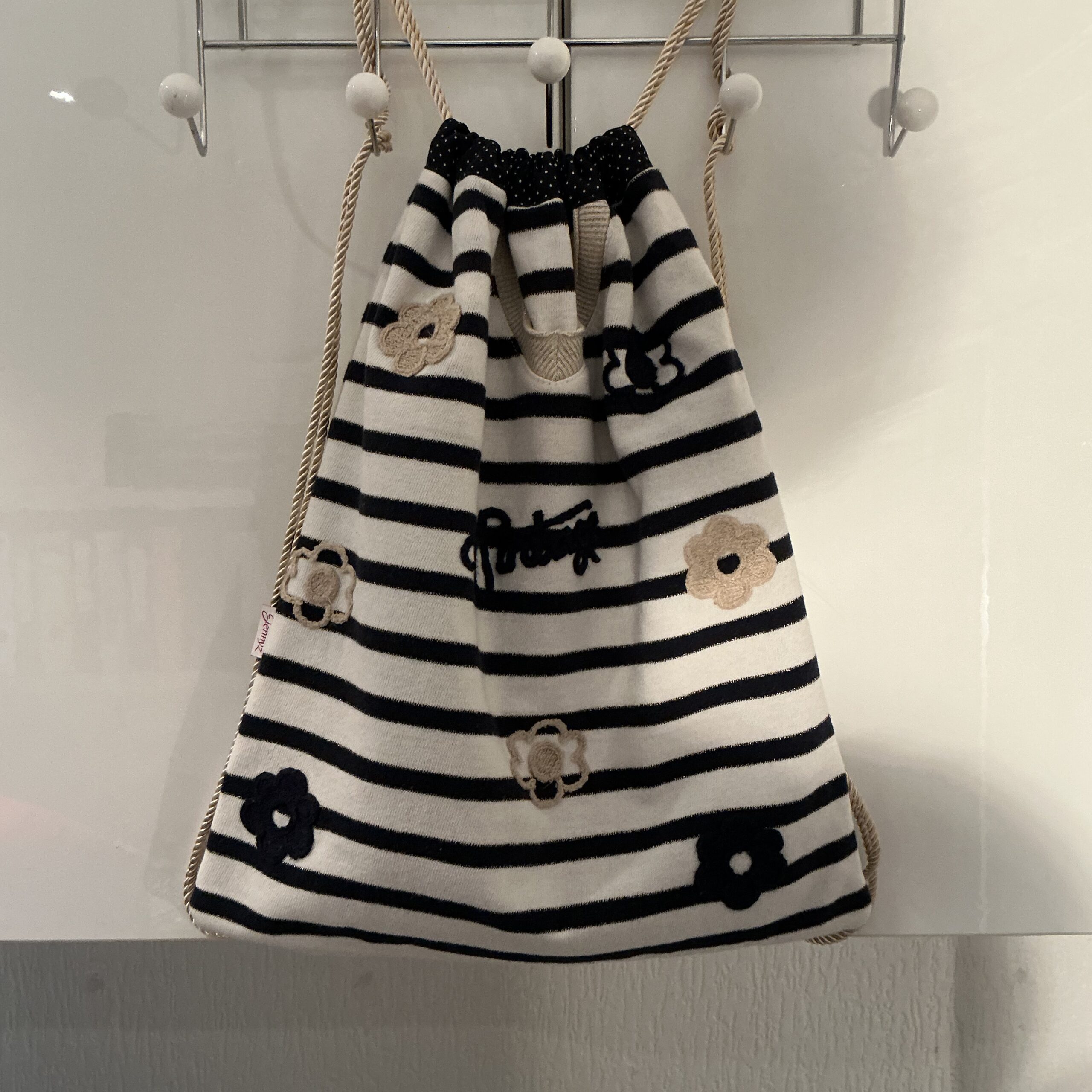 Deze bijzondere rugtas is met liefde gemaakt van een trui met op gehaakte bloemen. Wat ooit een zachte kledingstuk was, heeft nu een tweede leven gekregen als stijlvolle duurzame tas. Omdat we werken meet bestaande materialen kan de stof lichte gebruikssporen vertonen.Uiteraard zijn er geen vlekken of beschadigingen.