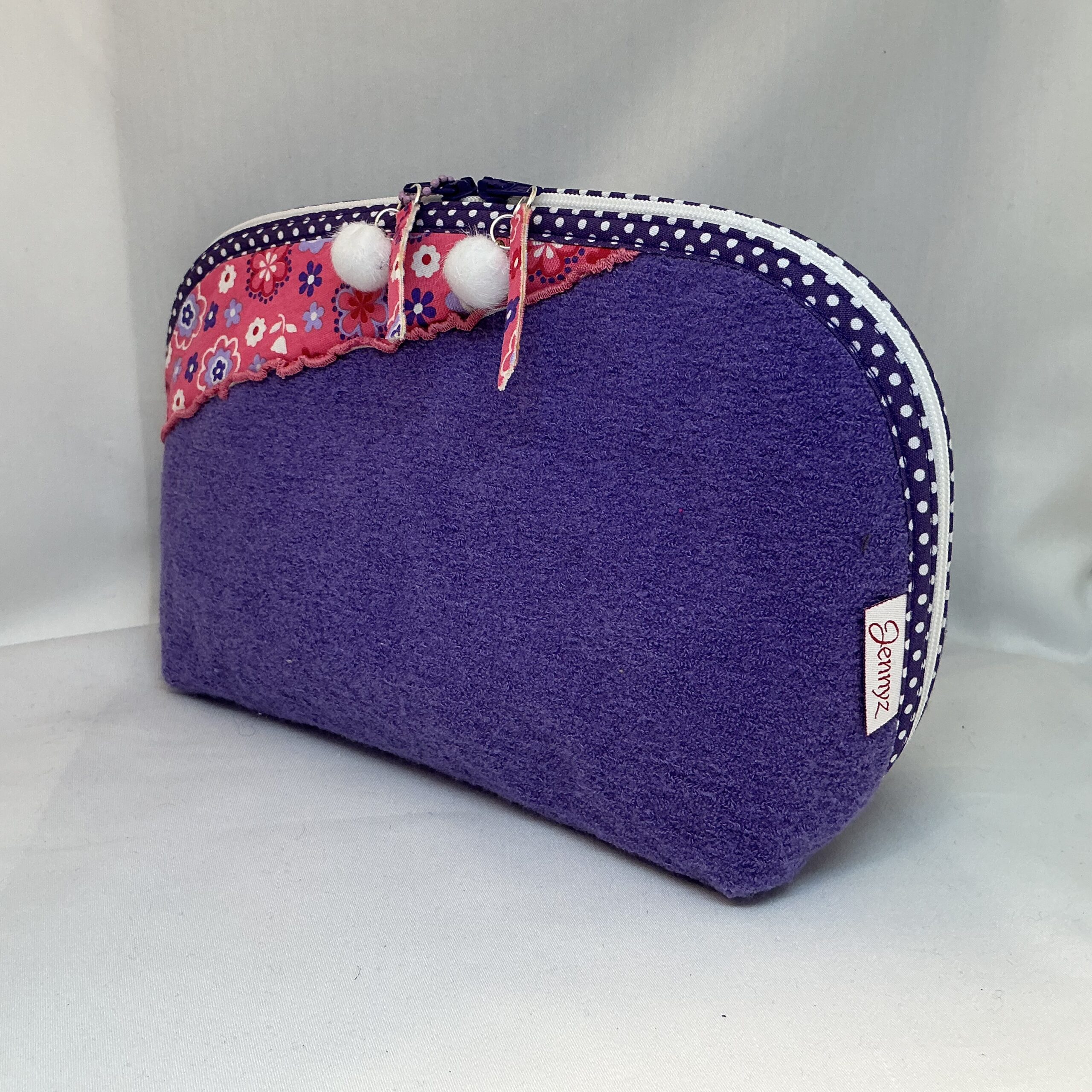 Deze middelgrote toilettas is handgemaakt van gedragen kleding van zachte stof en daardoor voelt de etui zacht aan. De afbeeldingen van geborduurde bloemen geeft de tas een vrolijke en speelse uitstraling. Omdat we werken met bestaande materialen kan de stof lichte gebruikssporen vertonen. Uiteraard zijn de afwerkingen en voering nieuwe stoffen gebruikt. De toilettas is afgebiesd met paars met stip katoenen baisband, wat zorgt voor een bijzondere finishing touch.