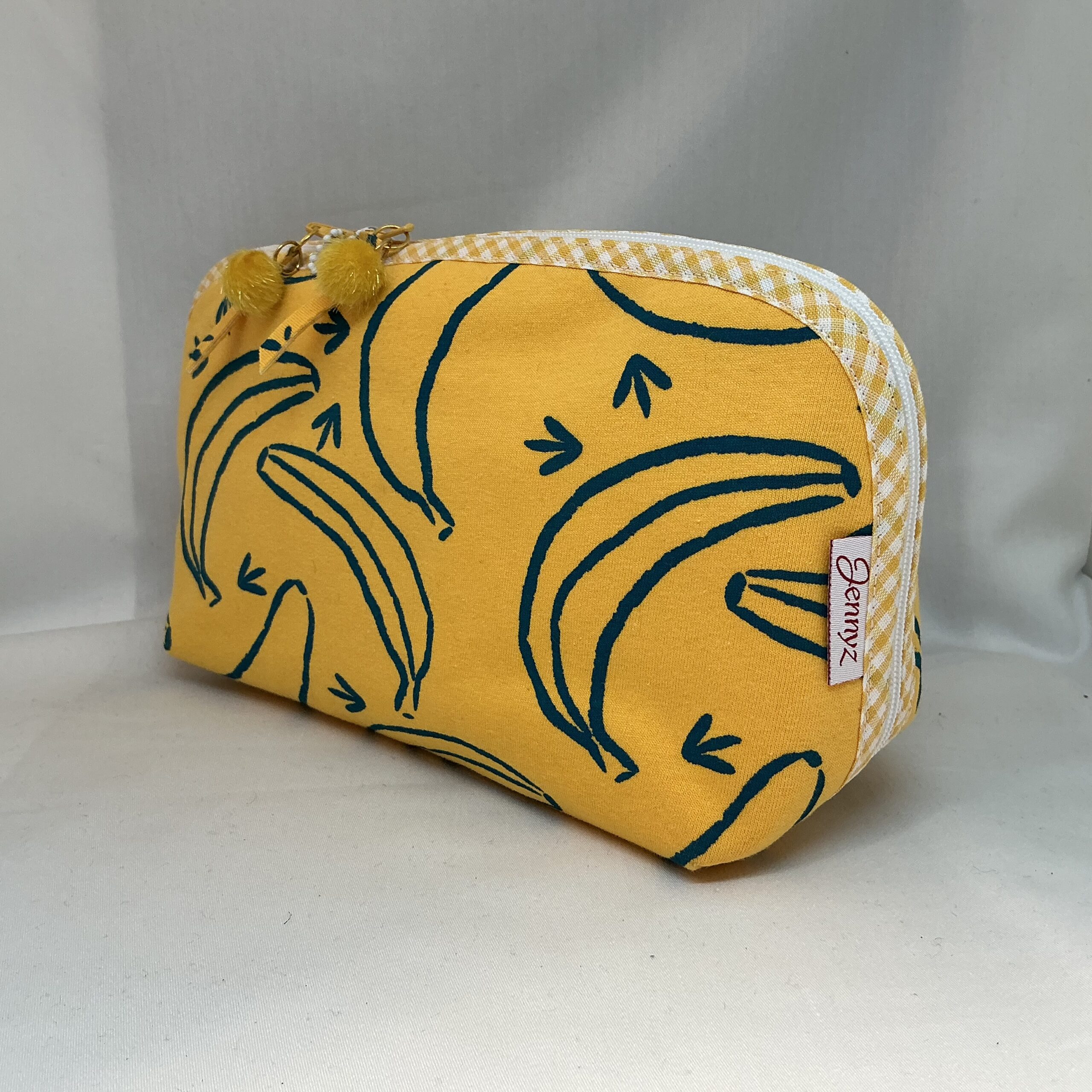 Deze middelgrote toilettas is handgemaakt van gedragen kleding van zachte tricot en daardoor helemaal uniek. De tekst “YES!” geeft de tas een stoere en speelse uitstraling. De toilettas is geel en bedrukt met bananen, afgebiesd met geel geruit katoenen baisband, wat zorgt voor een bijzondere finishing touch. Omdat we werken met bestaande materialen kan de stof lichte gebruikssporen vertonen. Uiteraard zijn de afwerkingen en voering nieuwe stoffen gebruikt
