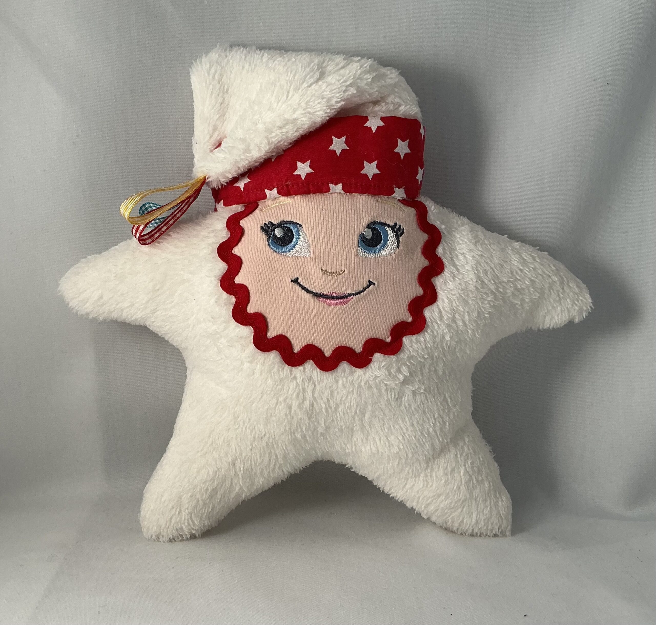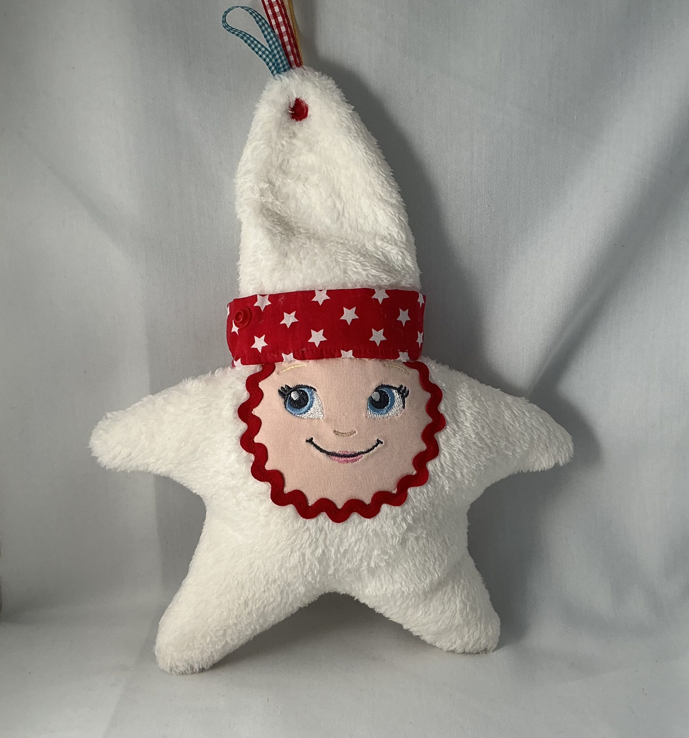 Maak kennis met deze vrolijke sterknuffel! Zacht, speels en helemaal met de hand gemaakt. Het gezicht is geborduurd dus veilig voor de kleine. In de muts zit een verrassend piepgeluid verstopt voor extra speelplezier. De drie geluste lintjes aan het einde nodigen uit tot voelen, trekken en ontdekken. Dankzij de drukknop blijft de muts netjes op zijn plek tijdens het spelen en knuffelen