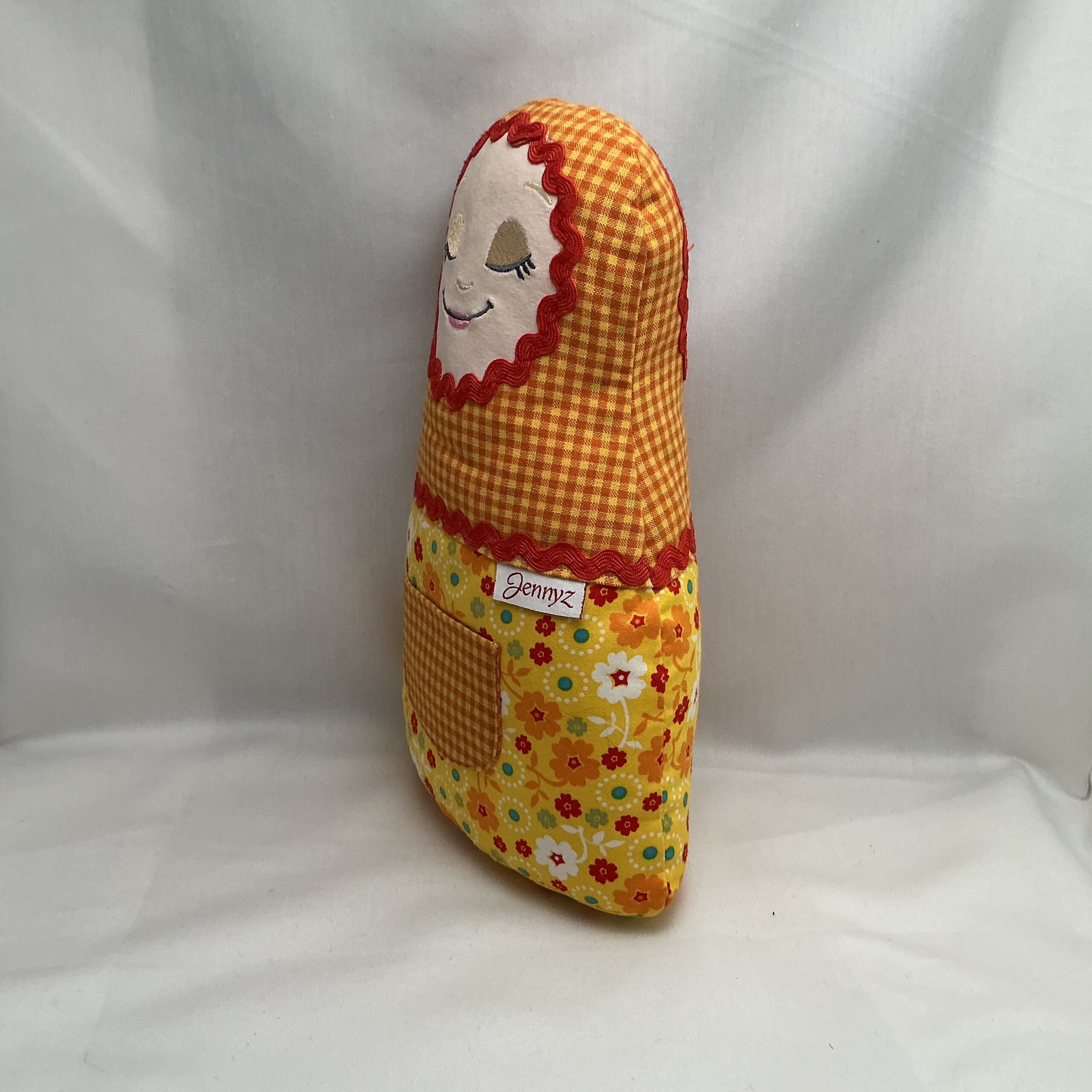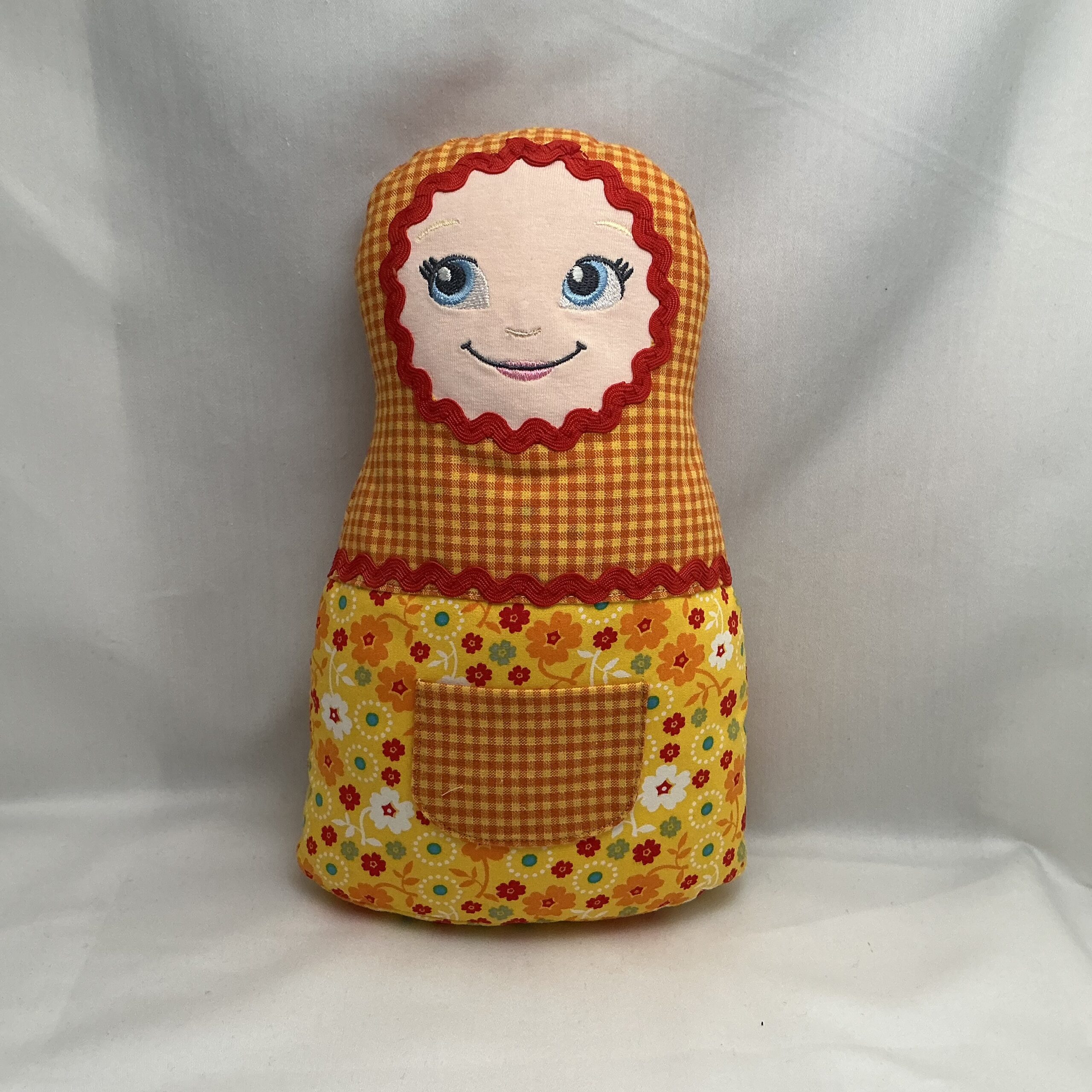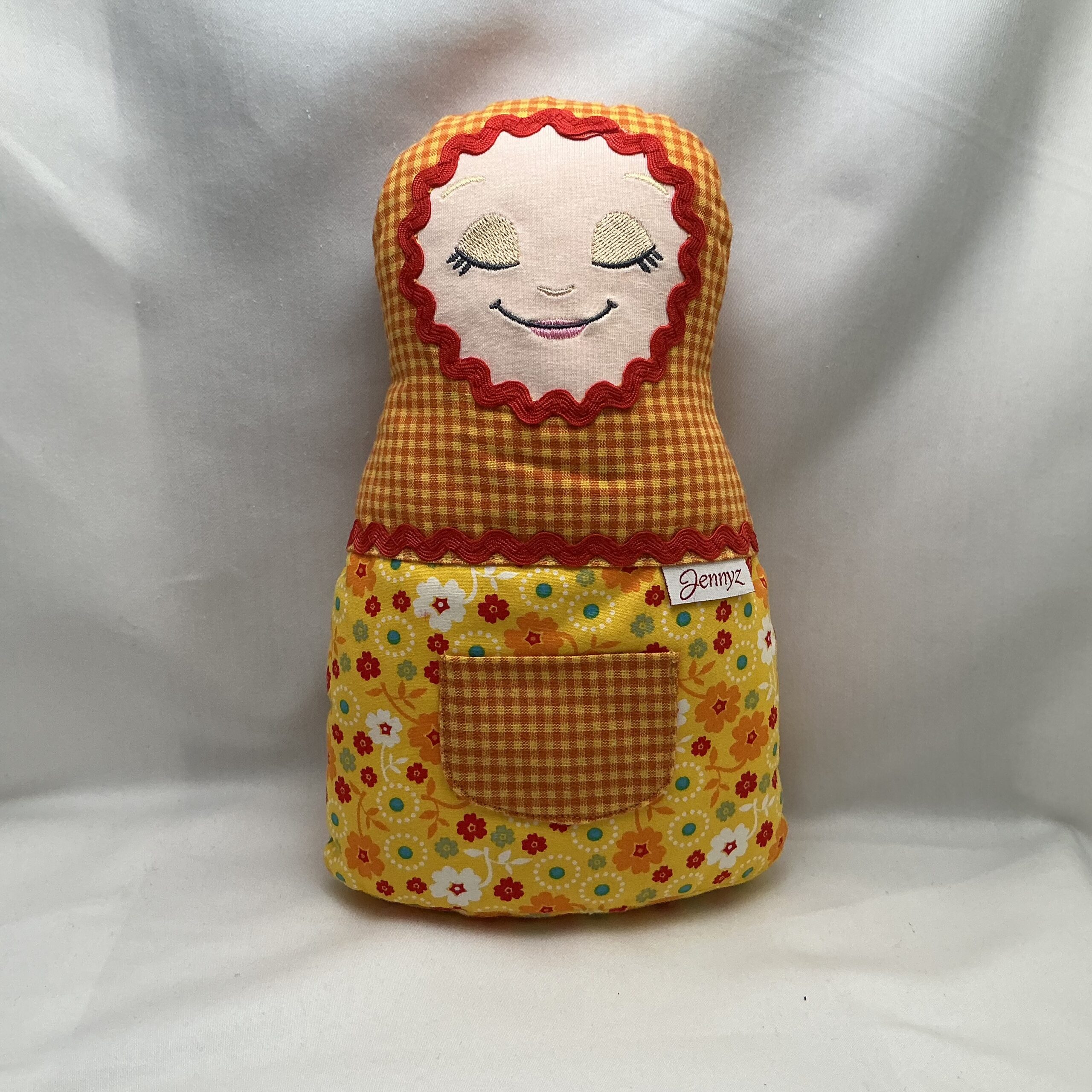 Deze zachte handgemaakte pop is gemaakt van een vrolijke katoenen stof en gevuld met een heerlijk zachte vulling. De pop heeft aan zowel de voor- als achterkant een geborduurd gezichtje: één met gesloten oogjes voor wanneer de pop slaapt, en één met open oogjes voor wanneer de pop wakker is. Dit geeft de pop een speels en liefdevol karakter.